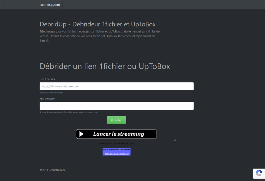 Debridup est un service de téléchargement illimité qui vous permet de télécharger instantanément tous les fichiers disponibles sur des plateformes de téléchargement telles que Uptobox et 1fichier sans aucune restriction.