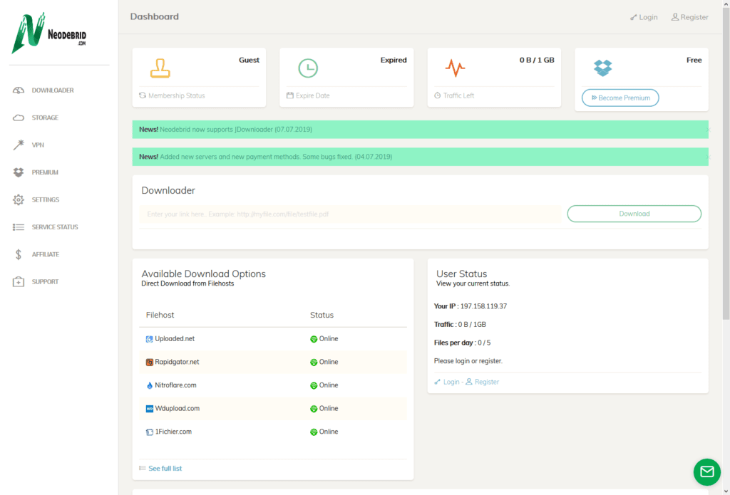 Neodebrid.com est un service gratuit et premium multi-hôtes et débridés. Il vous permet de télécharger depuis de nombreux sites des fichiers différents tels que Uploaded, Nitroflare, Wdupload, 1Fichier, Share-online.biz et bien d’autres.